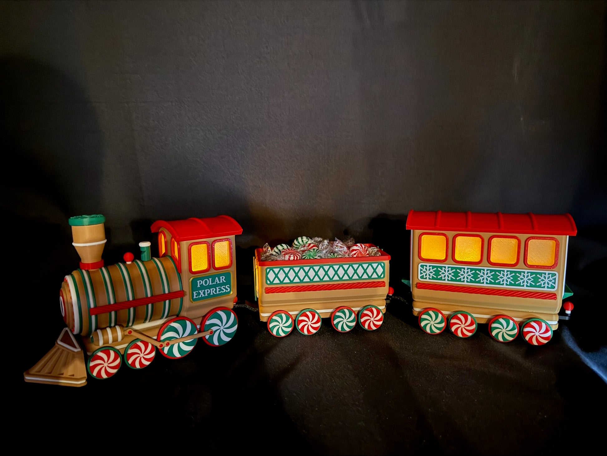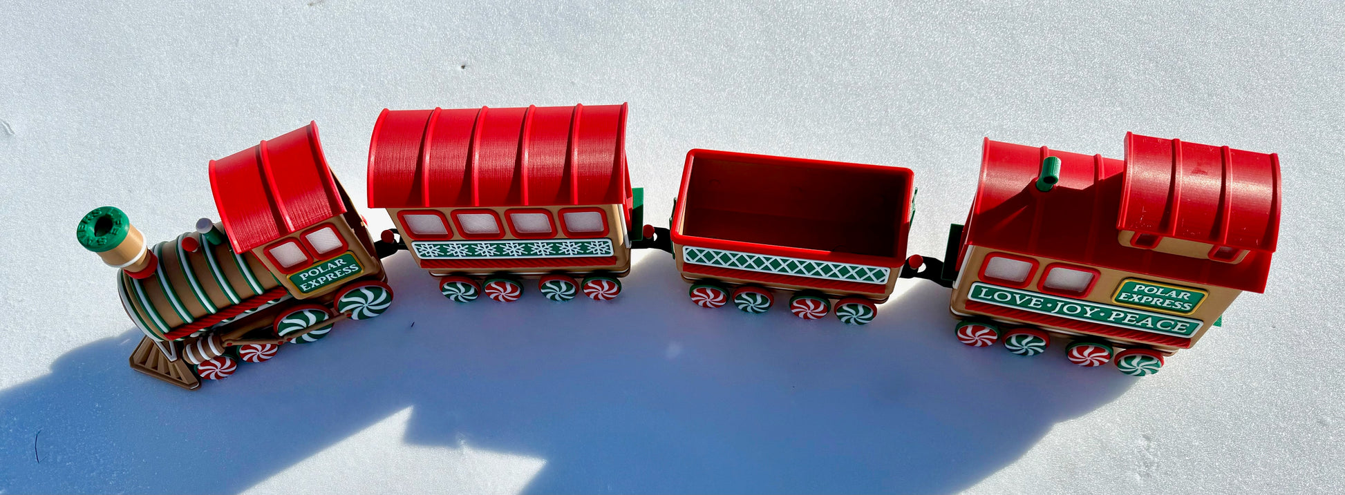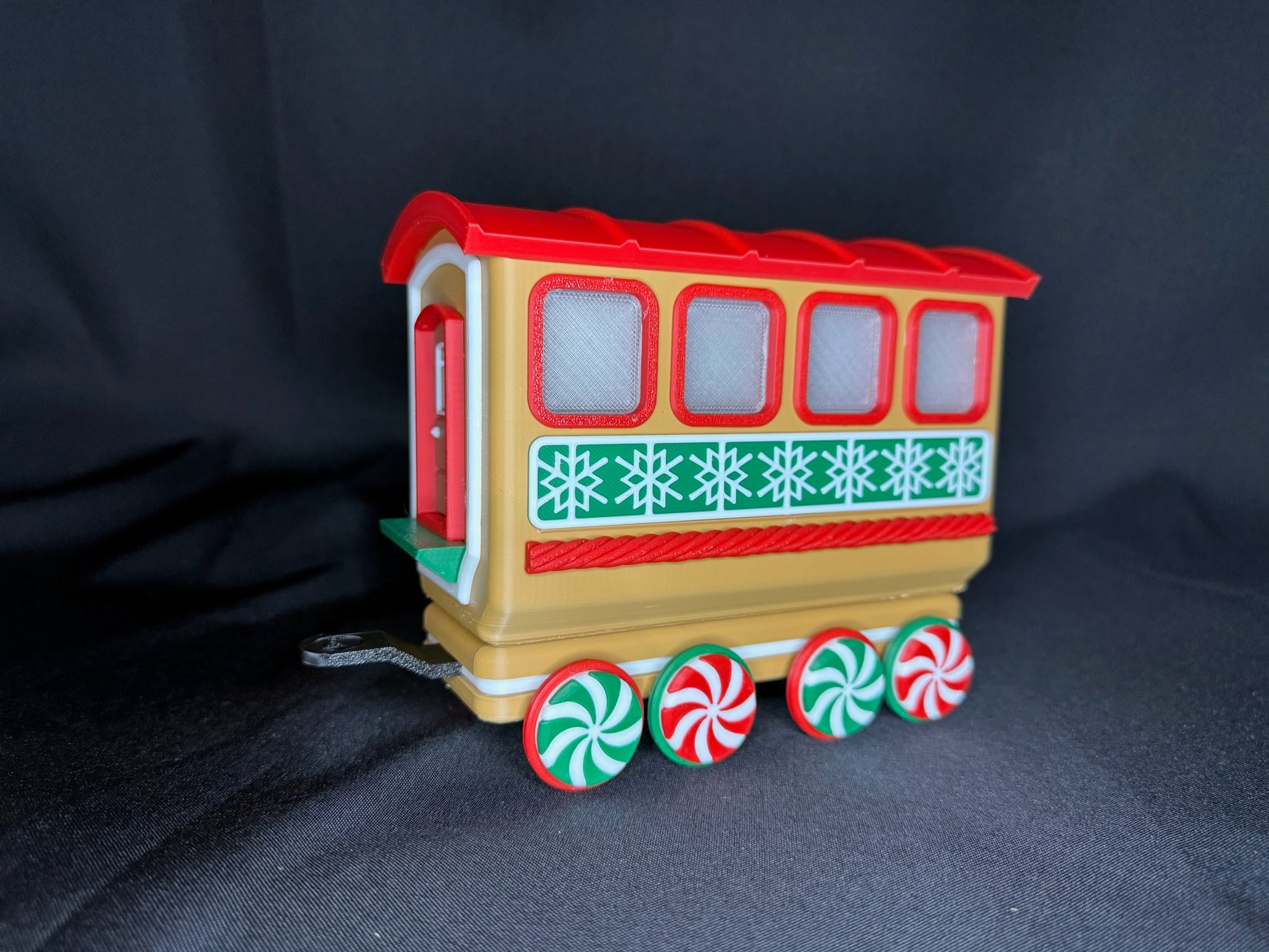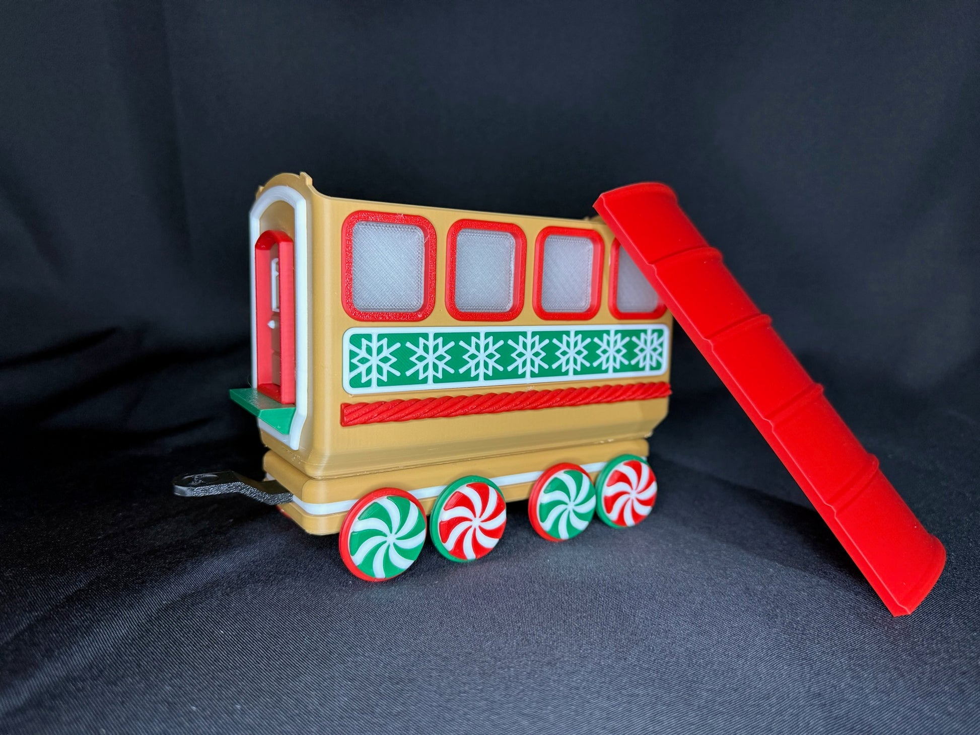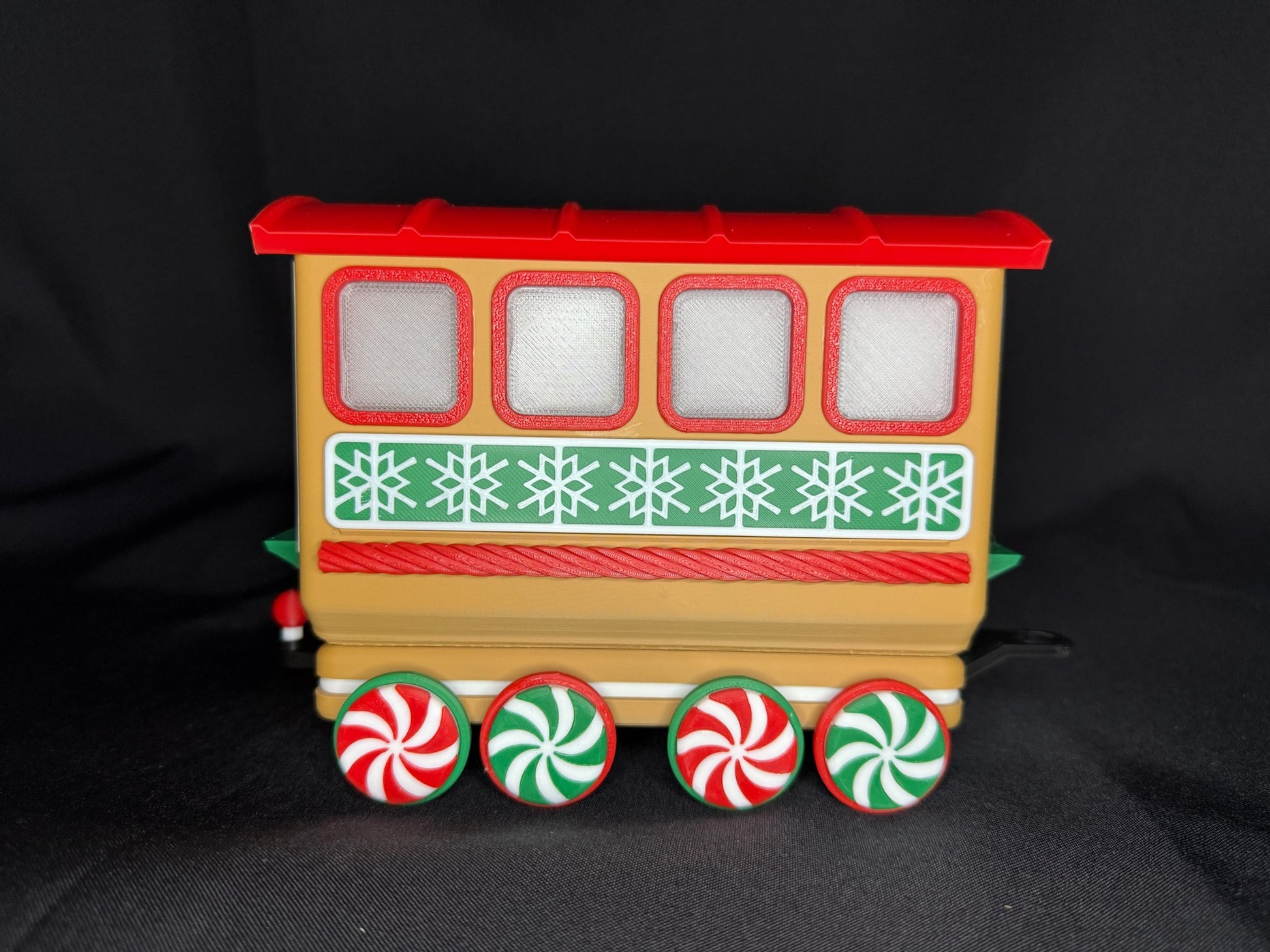 Chaque pièce est imprimée en 3D avec du plastique PLA de haute qualité et assemblée à la main avec une grande attention aux détails. Des roues en bonbons à la menthe aux flocons de neige gravés sur les côtés, chaque wagon apporte son propre charme festif. Le wagon ouvert est parfait pour y déposer des bonbons emballés, des mini décorations ou d’autres petits trésors de Noël. Pour une ambiance encore plus chaleureuse, la locomotive et les deux wagons arrière sont conçus pour accueillir des bougies chauffe-plat DEL—créant une douce lueur qui donne vie au train.