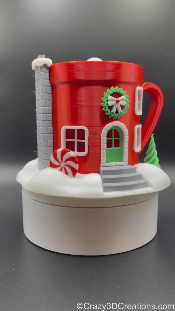 La tasse repose sur un socle qui imite un tapis de neige, parsemé de sucreries de Noël et d'un mini sapin, renforçant son allure festive.