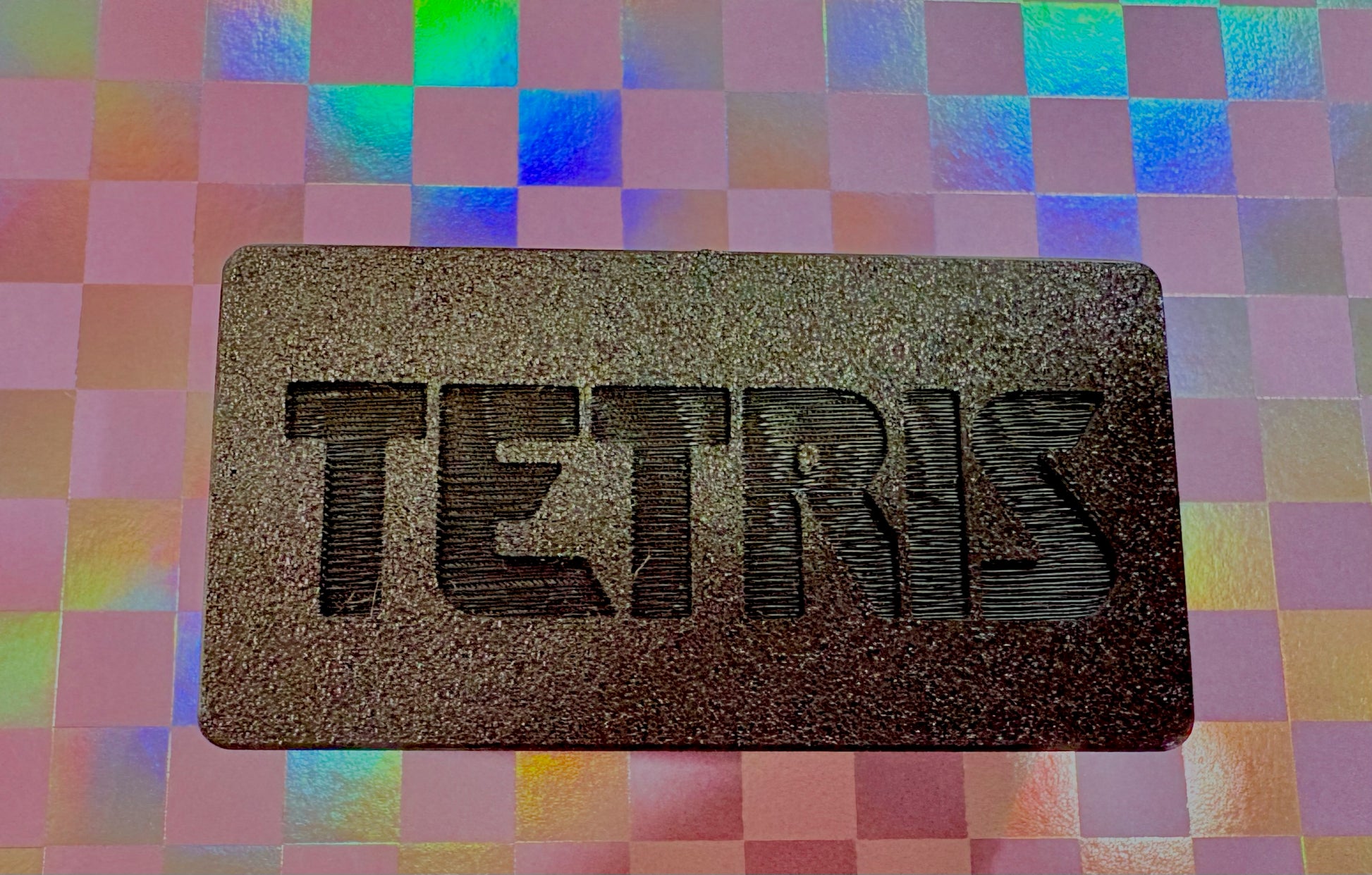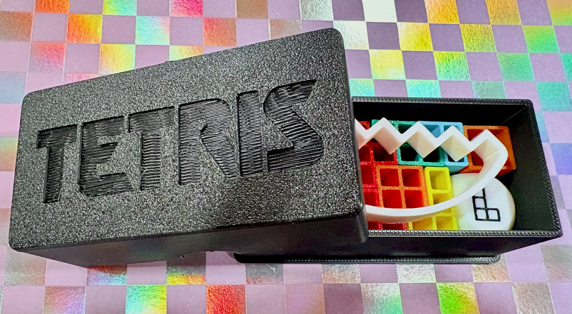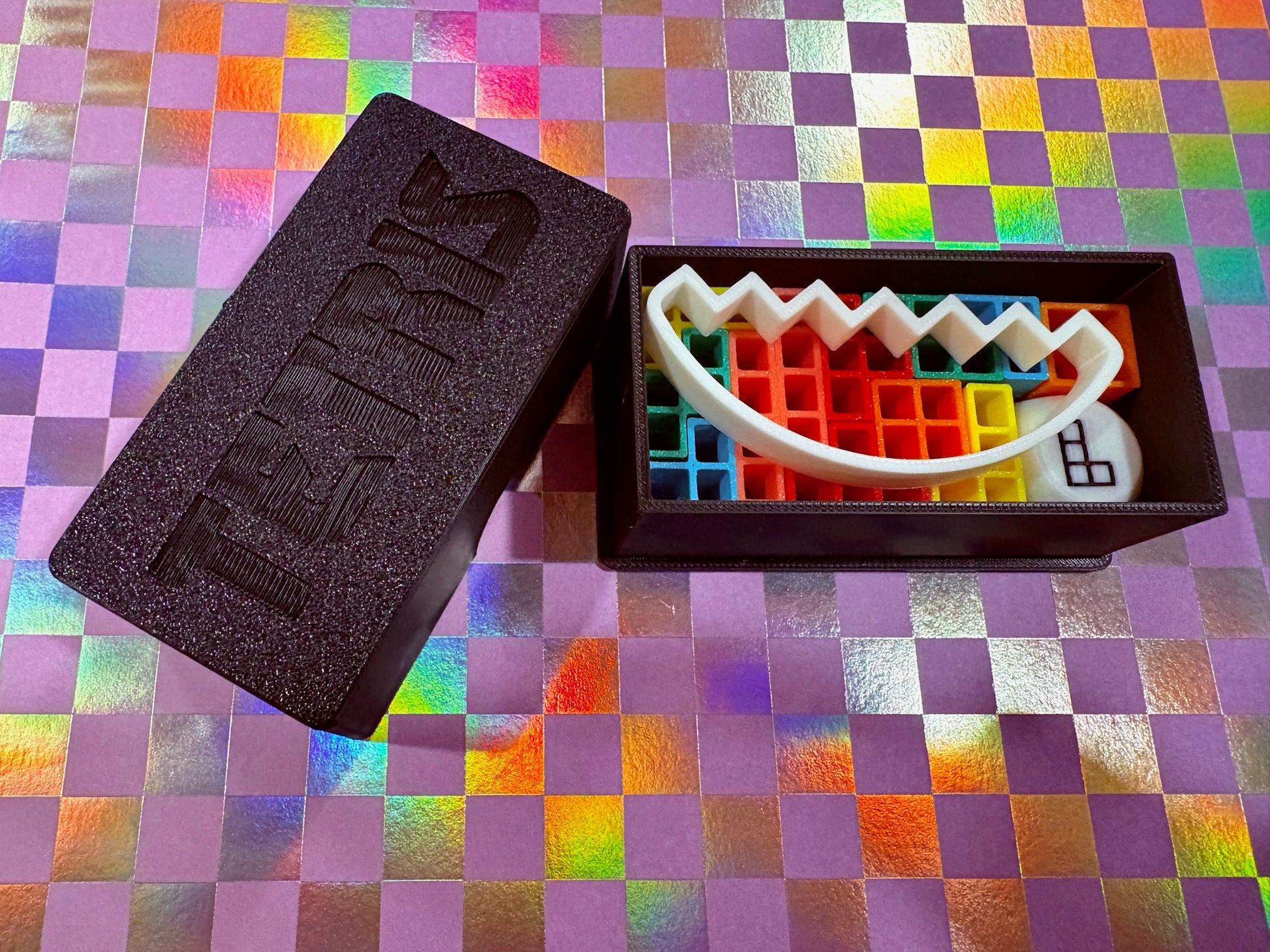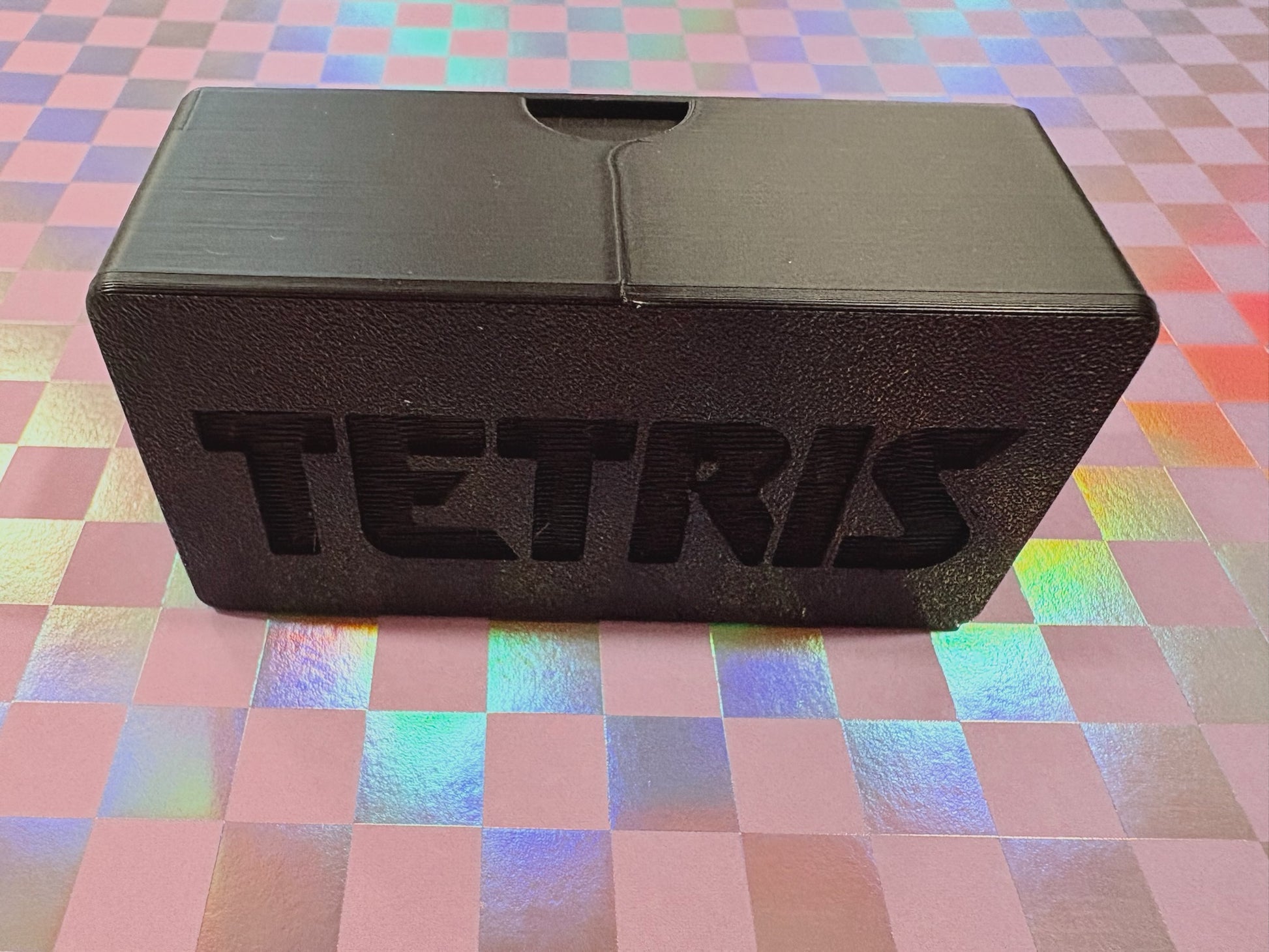 Une élégante boîte de rangement noire avec le mot « TETRIS » gravé sur le couvercle