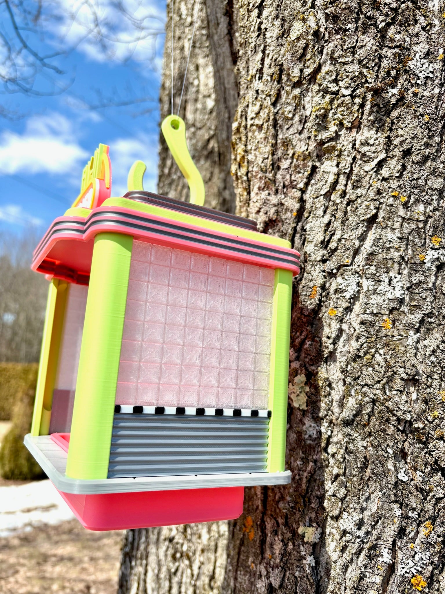 Hand-assembled with care, the feeder features a spacious tray for easy seed access and a hook for quick hanging. Its open-air design makes it simple to refill and clean, while the vibrant look adds a pop of personality to any tree or post.
