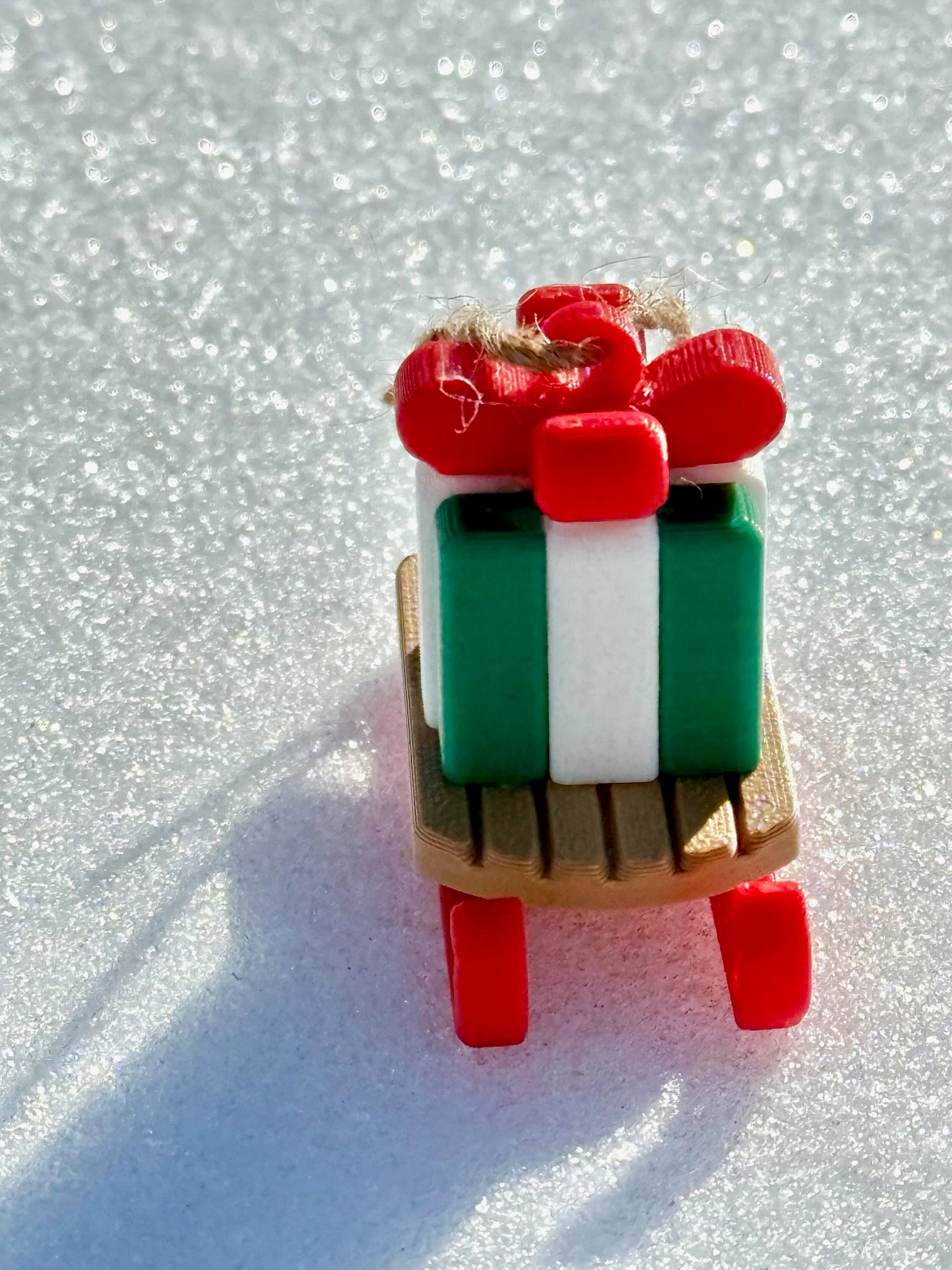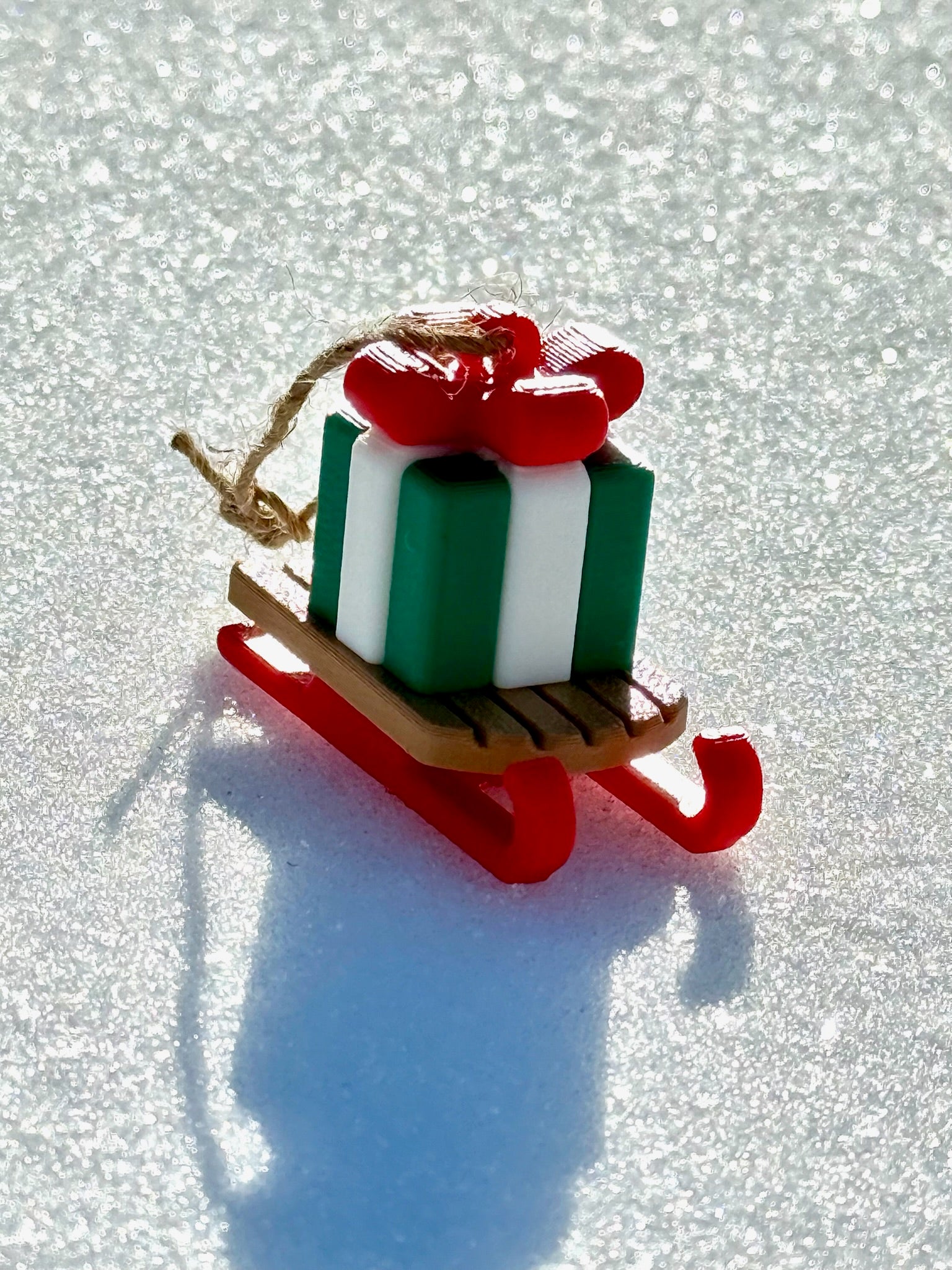Add a whimsical touch to your holiday décor with this delightful Gift Sled ornament! Featuring a bright green present wrapped with a white ribbon and topped with a bold red bow, this 3D-printed ornament sits atop a classic wooden-style sled, ready to slide straight into your Christmas celebrations.