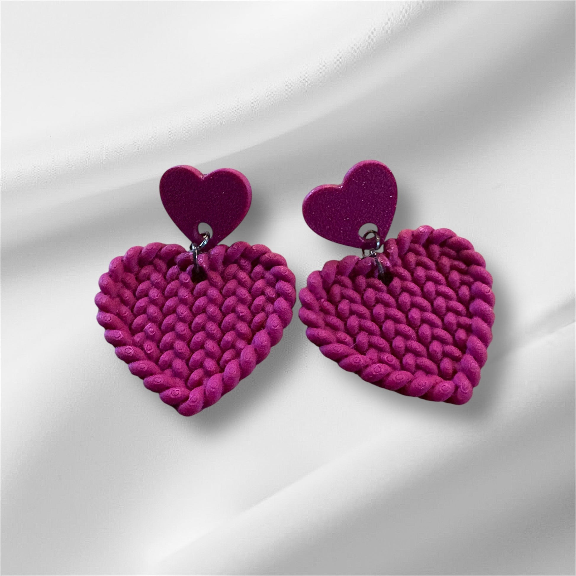 Designed, 3D‑printed, and hand‑finished by us, these statement earrings pair a textured knitted heart with a cute little heart stud on top—twice the charm, same feather‑light PLA comfort.
