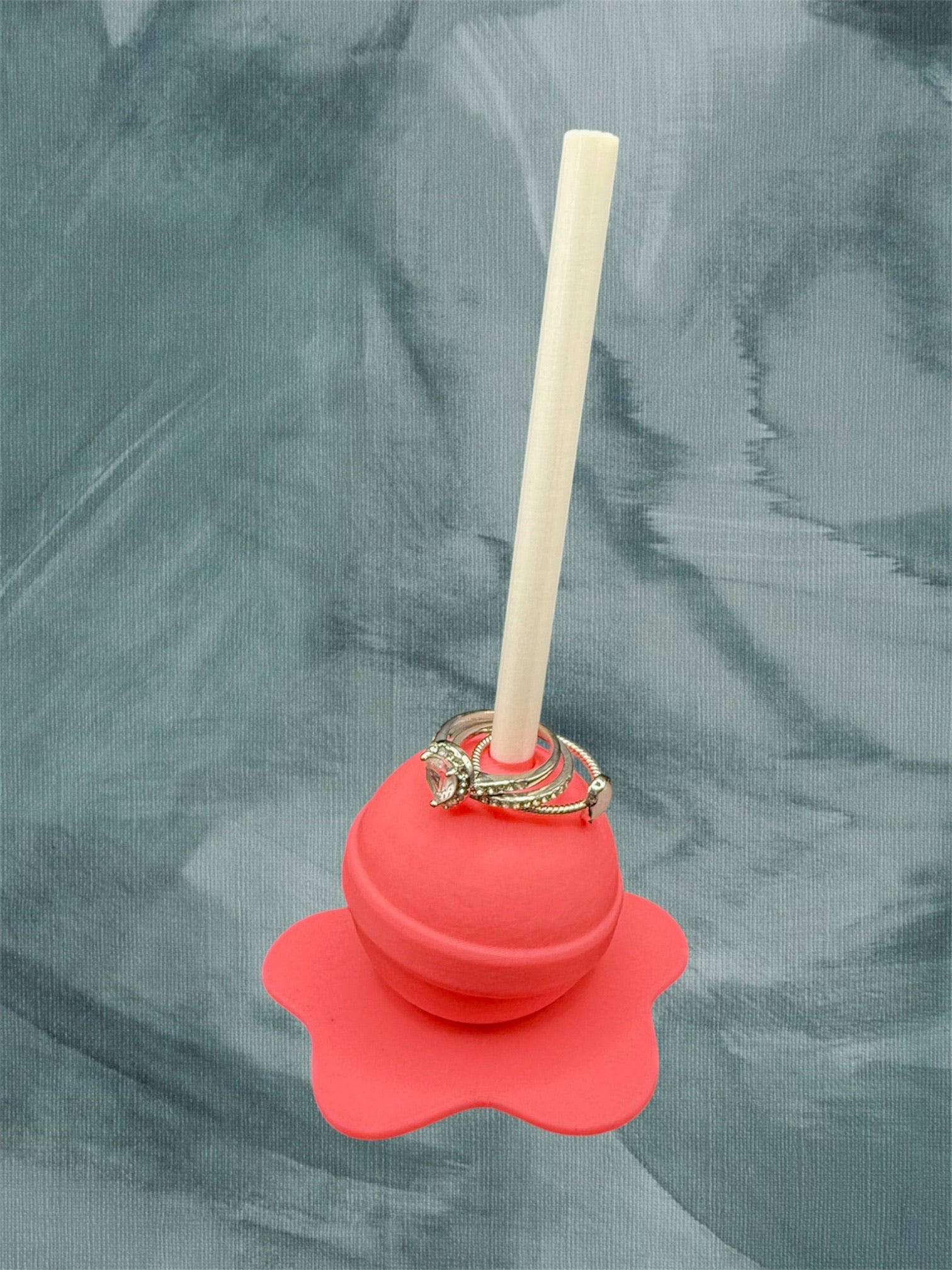 Add a pop of candy‑shop fun to your dresser or nightstand. This bright ring holder takes its cue from a classic lollipop: a smooth “candy” sphere on a wooden stick, anchored by a playful drip‑shaped base. Slip your rings over the stick or rest them on the rounded top—everything stays organized and easy to grab.