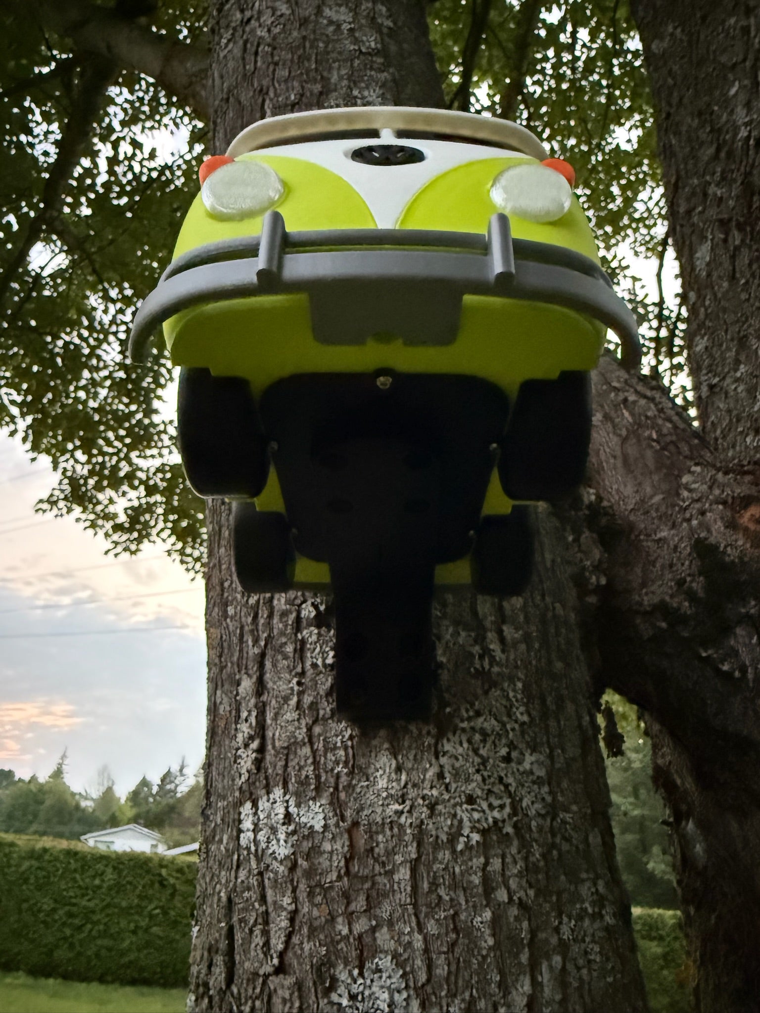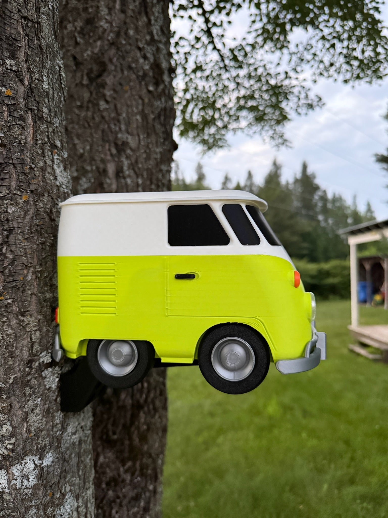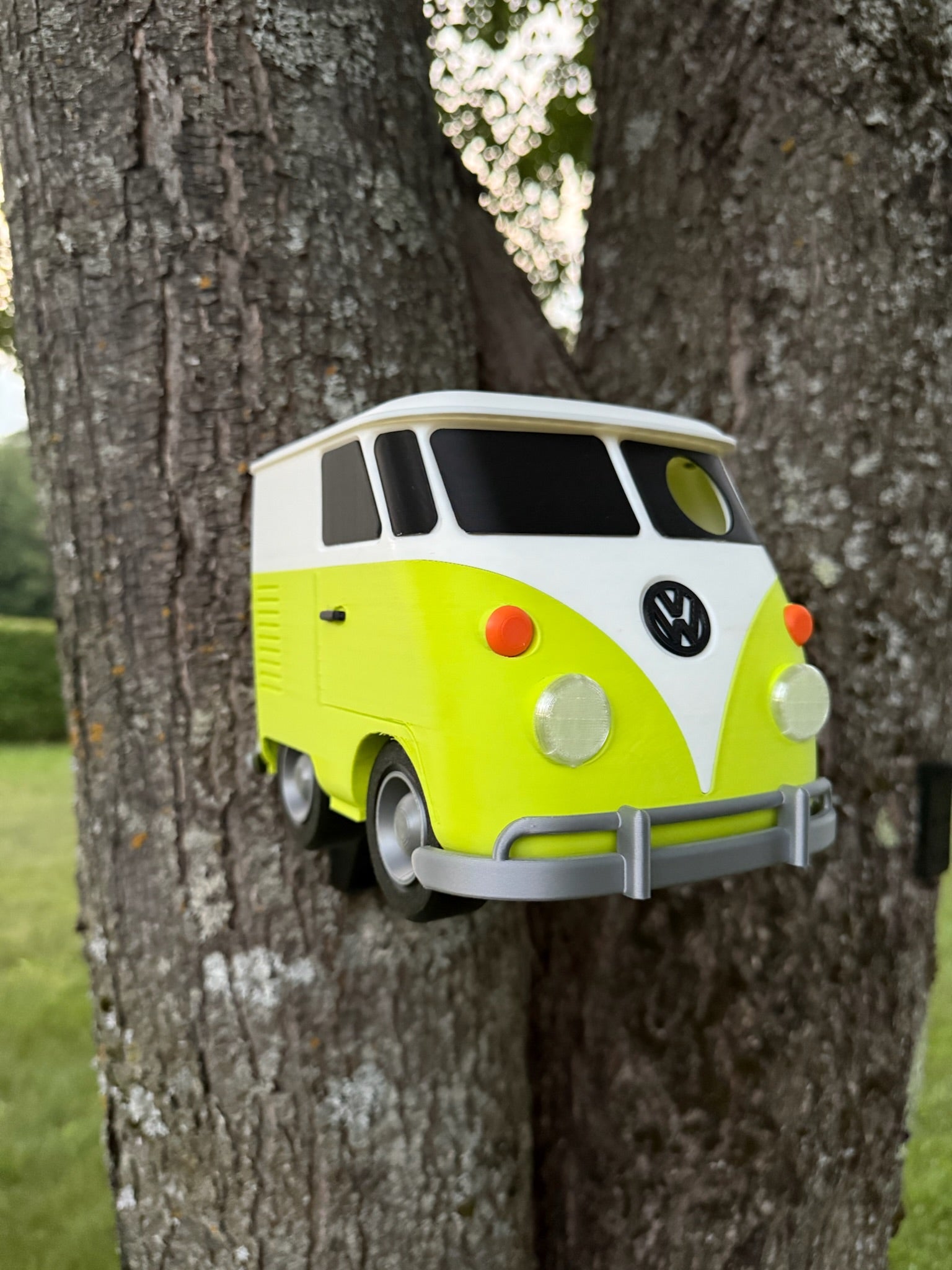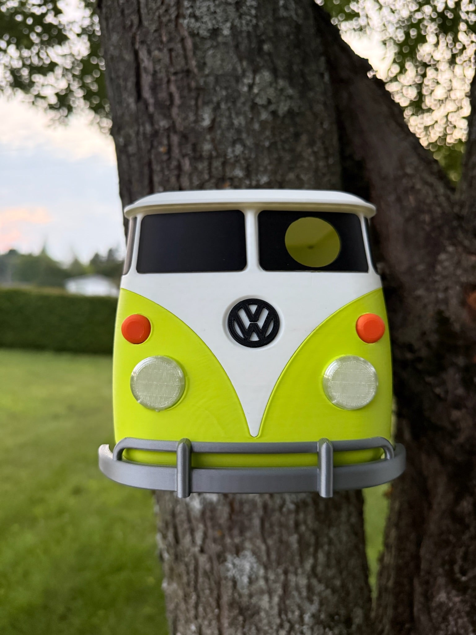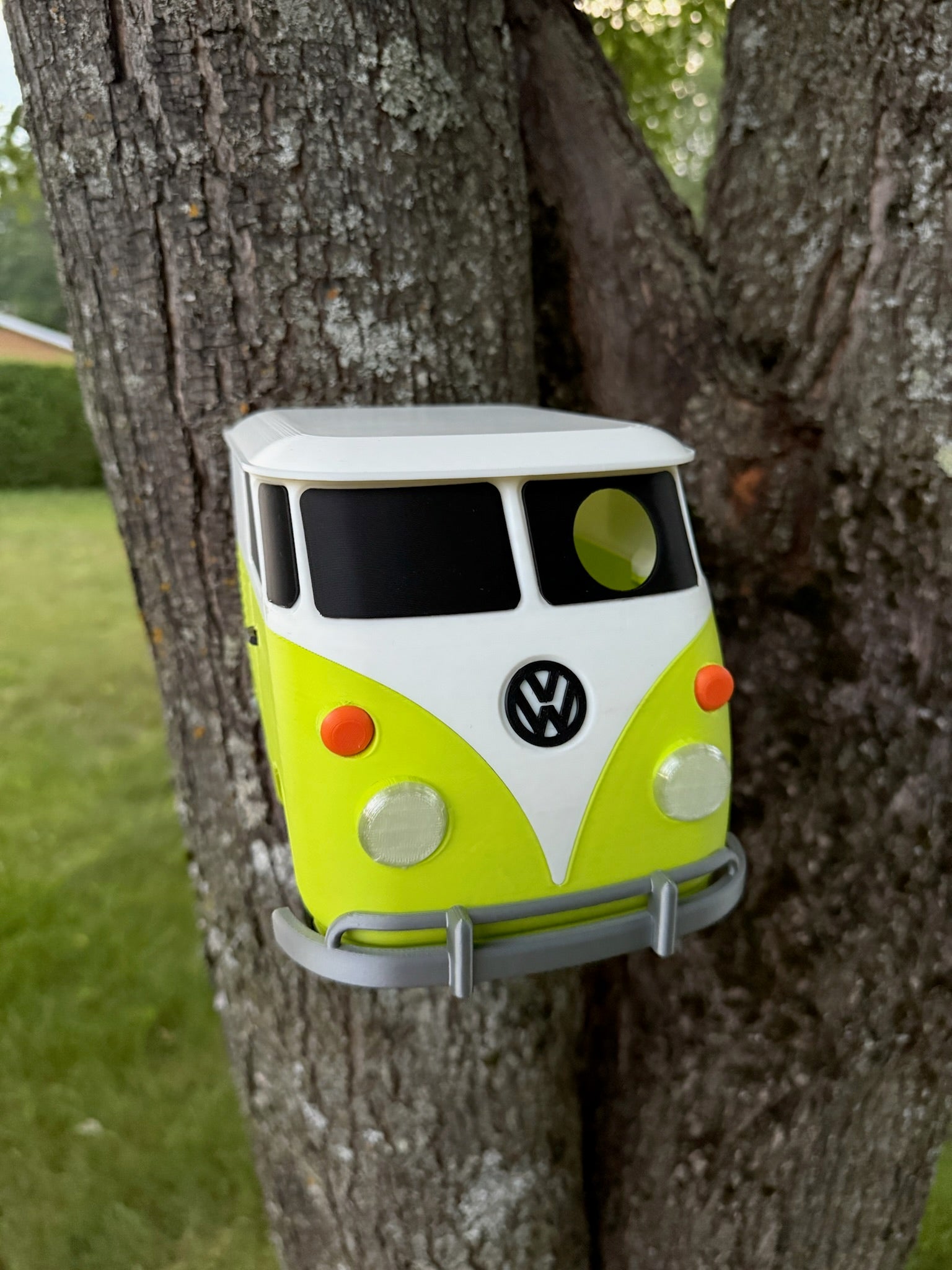 Bring a dose of adventure and vintage flair to your backyard with this bus‑inspired birdhouse! Modeled after a classic camper van, it’s a playful piece for bird lovers and retro fans alike. With its bold two‑tone body, curved windows, and bumper details, it’s sure to turn heads—and welcome wings.